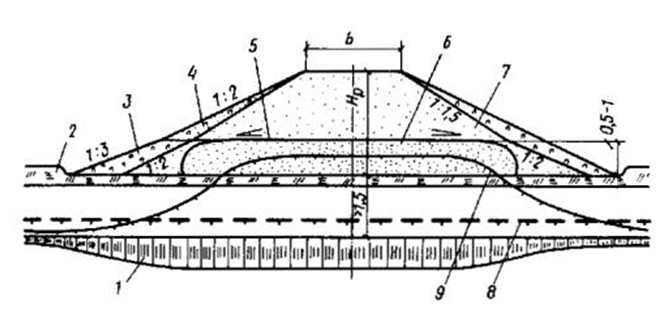 Abb. 6: Im Der Verlauf der Auftaugrenze ist erheblich heraufgezogen worden und eine Art Dampfsperre (Geotextil) verhindert das Auswachen des Bahndamms (Legende: 1 Eis, 2 Moos und Mutterboden, 3 Torf, 4 Torfgemisch, 5 Geotextilien, 6 Sand, 7 Boden Böschung, 8 Auftautiefe des Bodens vor dem Bau von Dämmen, 9 der neue Auftautiefenverlauf, Hp Höhe der Böschung (Quelle: [13])). Heute stellt man an Eisenbahnstrecken hohe Ansprüche an Fahrgeschwindigkeit, Transportvolumen und ganzjähriger Verfügbarkeit, ohne dass Instandhaltungsmaßnahmen nennenswerte, wiederkehrende Unterbrechungen verursachen. Im heutigen Russland sind diese Forderungen an die Ob-Bowanenkowo-Bahn [14] und damit auch an den dazugehörigen Bahndamm gestellt worden. Die technischen Vorgaben sind kein Staatsgeheimnis mehr [15] (so wie dies zu Sowjetzeiten für ganze Streckenabschnitte über riesige Entfernungen galt), sondern auch im Westen hinreichend bekannt (Abb. 4).