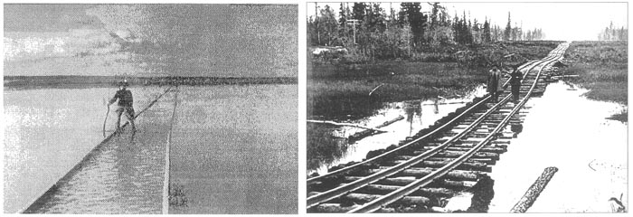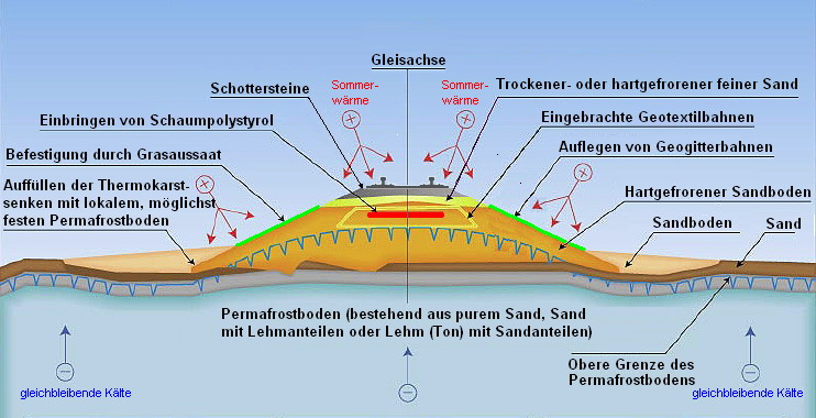 aufgeweicht und droht weggespült zu werden. Unkontrollierte Wasserbewegungen durch den Bahndamm (d. h. durch den Sand) führen unweigerlich zu Auswaschungen und damit zu Wellen im Gleisverlauf. Dies passiert dann, wenn das erst im Frühsommer – dann aber auch sehr schnell – einsetzende massive Tauwetter (in manchen Wintern gibt es vielerorts bis zu zwei Meter Schnee) die gesamte Landschaft überflutet. Der untere Teil des Damms, der ja fast immer aus Sand gebaut wurde und in Höhe der sumpfigen Umgebung stand, wird unweigerlich angegriffen. Von einem kontrollierten und bahndammschonenden Abfluss des Wassers, in dieser flachen Gegend über viele Wochen kann nicht mehr die Rede sein. Das Wasser fließt nur langsam ab. Versickern kann es wegen des Permafrostbodens ja nicht. Es kommt zwangsläufig zu Unterspülungen des Bahndammfußes und später der gesamten Dammsohle. Der hohe Feuchtigkeitsgehalt im Sand erhöht die Wärmeleitfähigkeit und die Isolationsschicht wird in dieser Zeit wirkungslos. Ein thermisch wackliges Spiel zwischen dem höher gezogenen Frostboden und der Dammentwässerung und dies insbesondere zur Zeit der Schneeschmelze.